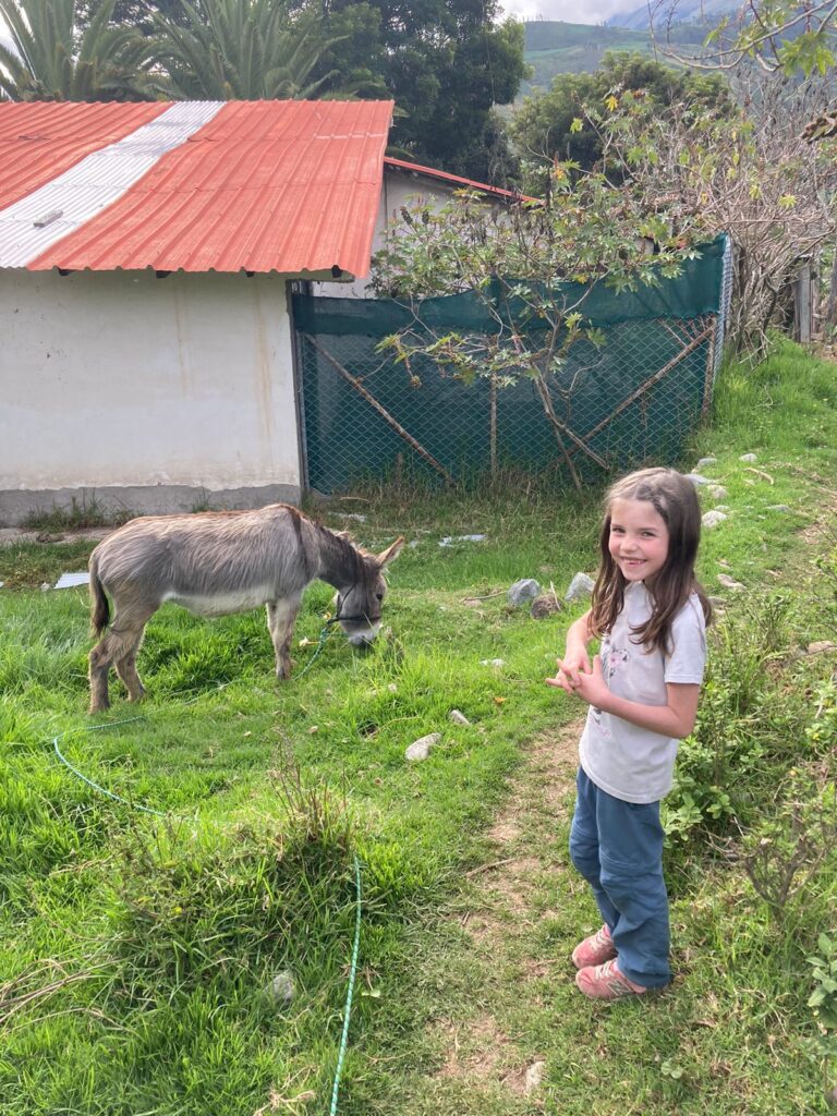 Mava mit unserem Esel Lilly und unserem Hund Sami. Ilay und Mava sind in Curahuasi mit dem Velo unterwegs.