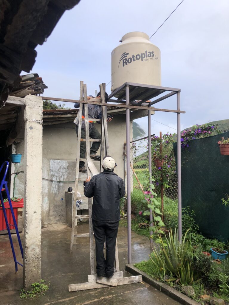 • unbenutzter Wassertank auf einem Stahlgerüst in 4 Metern Höhe montieren & anschliessen lassen (so haben wir einen höheren Wasserdruck und können auch abends duschen und abwaschen!)